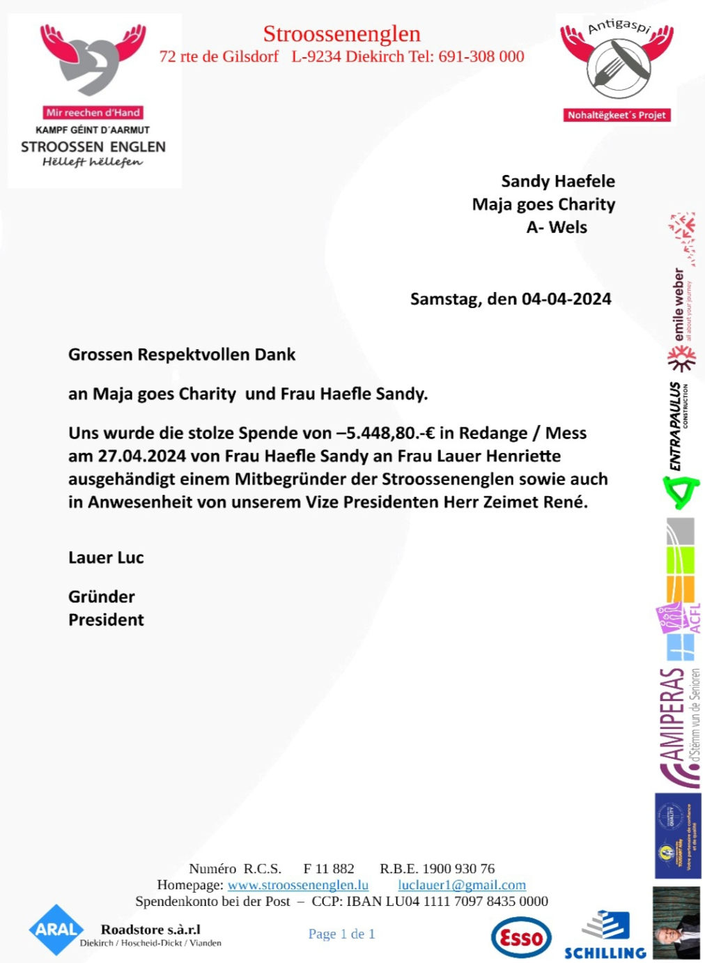 Am 27.04.2024 konnte eine Spendensumme in der Höhe von € 5448,80, an die Stroossenenglen, welche sich ehrenamtlich um Menschen und Familien in Not (obdachlos, Notlage, usw.) kümmern und diese mit dem Nötigsten versorgen übergeben werden.
