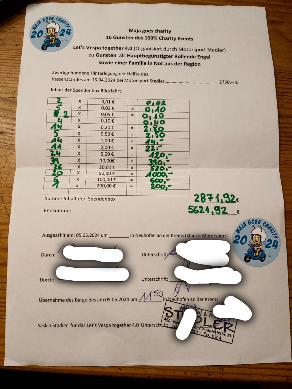 Ich konnte dank euch, eine Spendensumme in der Höhe von € 5621,92 an das Let's Vespa together 4.0 übergeben.